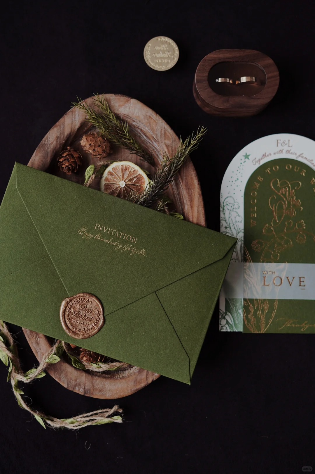 Forest-Inspired Wedding Invitation Green & Gold Foil Design