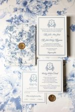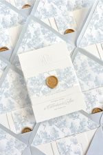 Elegant blue floral patterns on premium heavy-weight paper, paired with a gold wax seal envelope for a classic and timeless look. The full set includes the main invitation card, a wedding details card, and an RSVP card — thoughtful and complete, ensuring your guests feel the romance from the very first touch.
