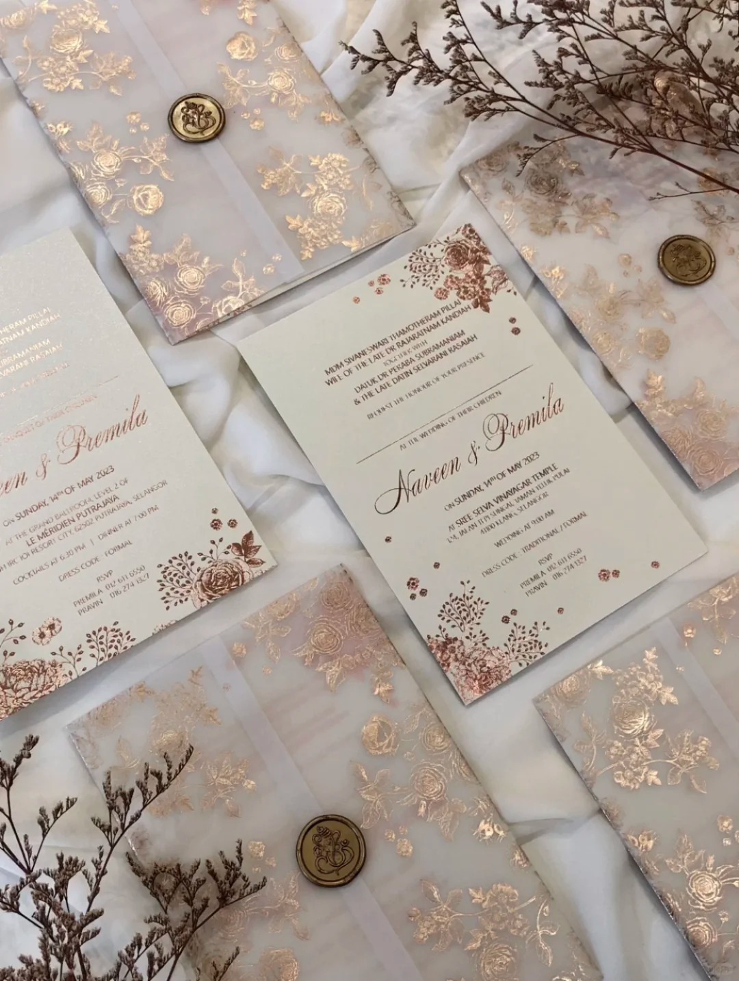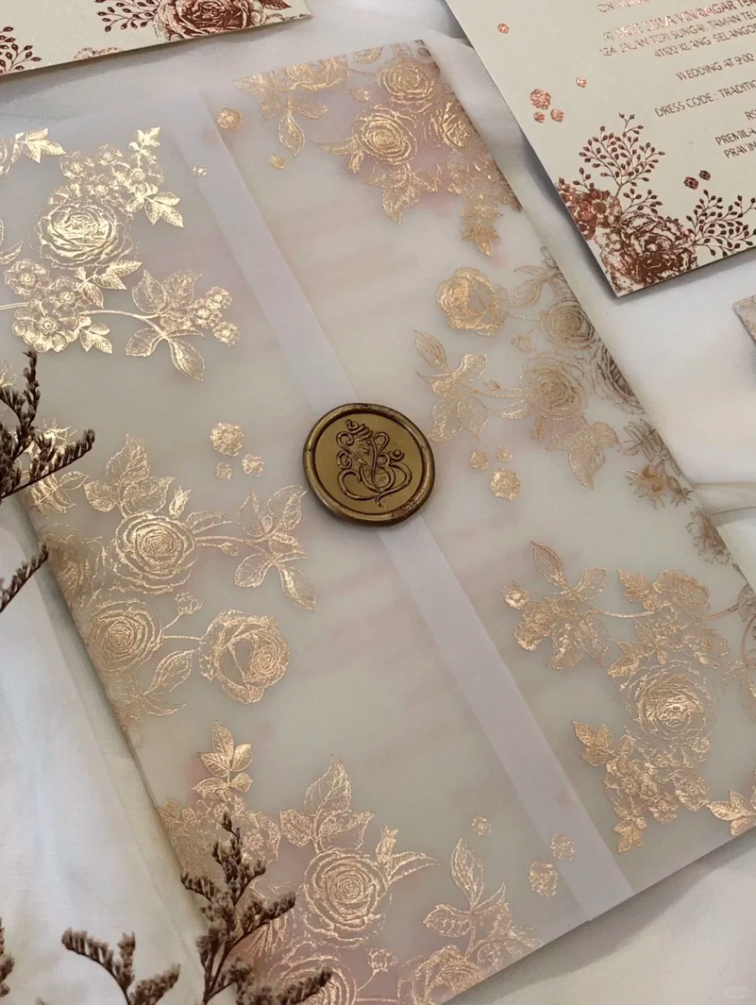 Featuring a translucent vellum jacket with exquisite rose gold floral foil stamping, creating a romantic layered effect. The envelope is finished with a custom wax seal for a touch of vintage elegance. Inside, the invitation card is crafted from premium heavyweight paper with refined typography, combining luxury and simplicity.