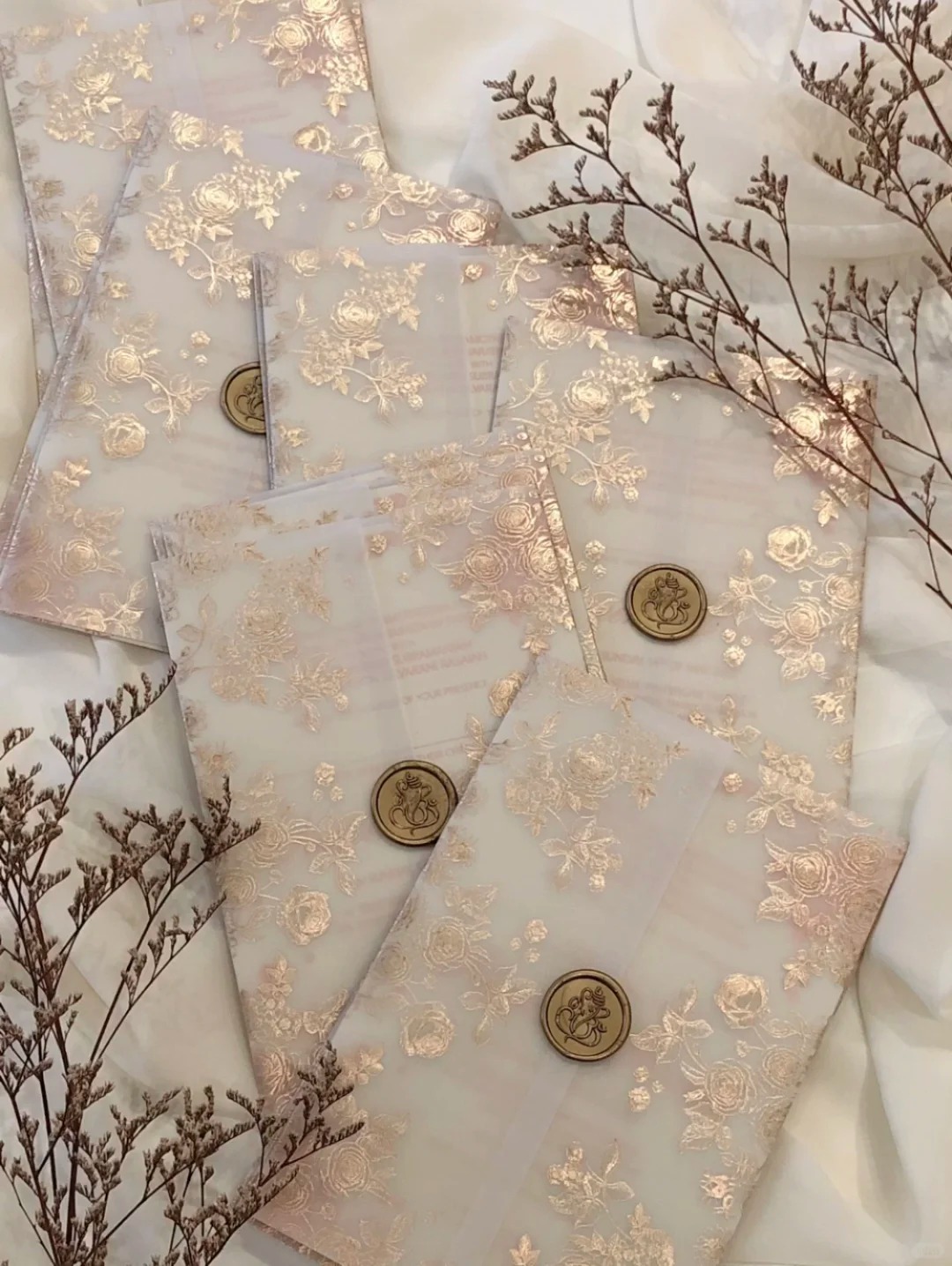 🌹 Highlights: Rose gold floral foil, translucent layering effect, vintage wax seal, elegant and luxurious style