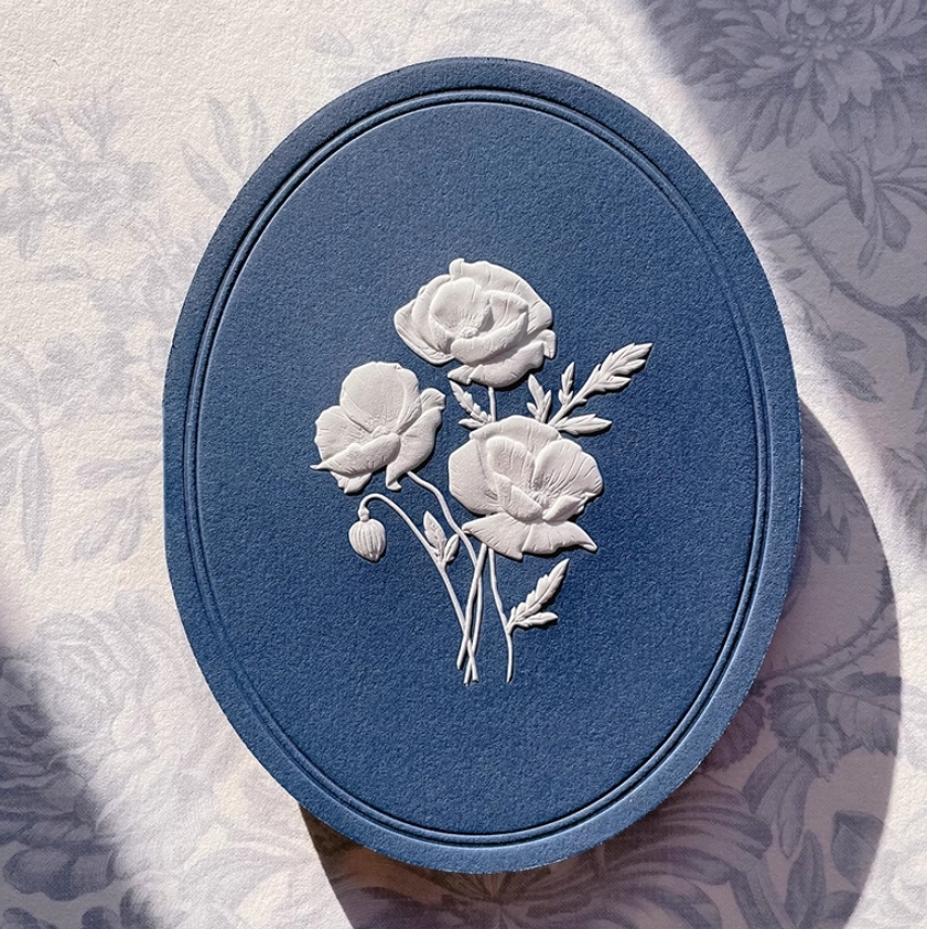 This card features a rich deep-blue base adorned with embossed white florals, resembling blossoms illuminated under the night sky—elegant, refined, and timeless. Its oval frame design blends classical grace with contemporary minimalism, making it an exceptional choice for invitations, greeting cards, and bespoke artistic creations.
