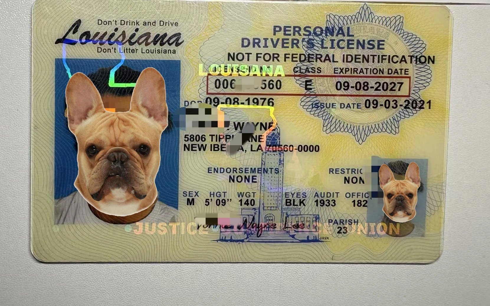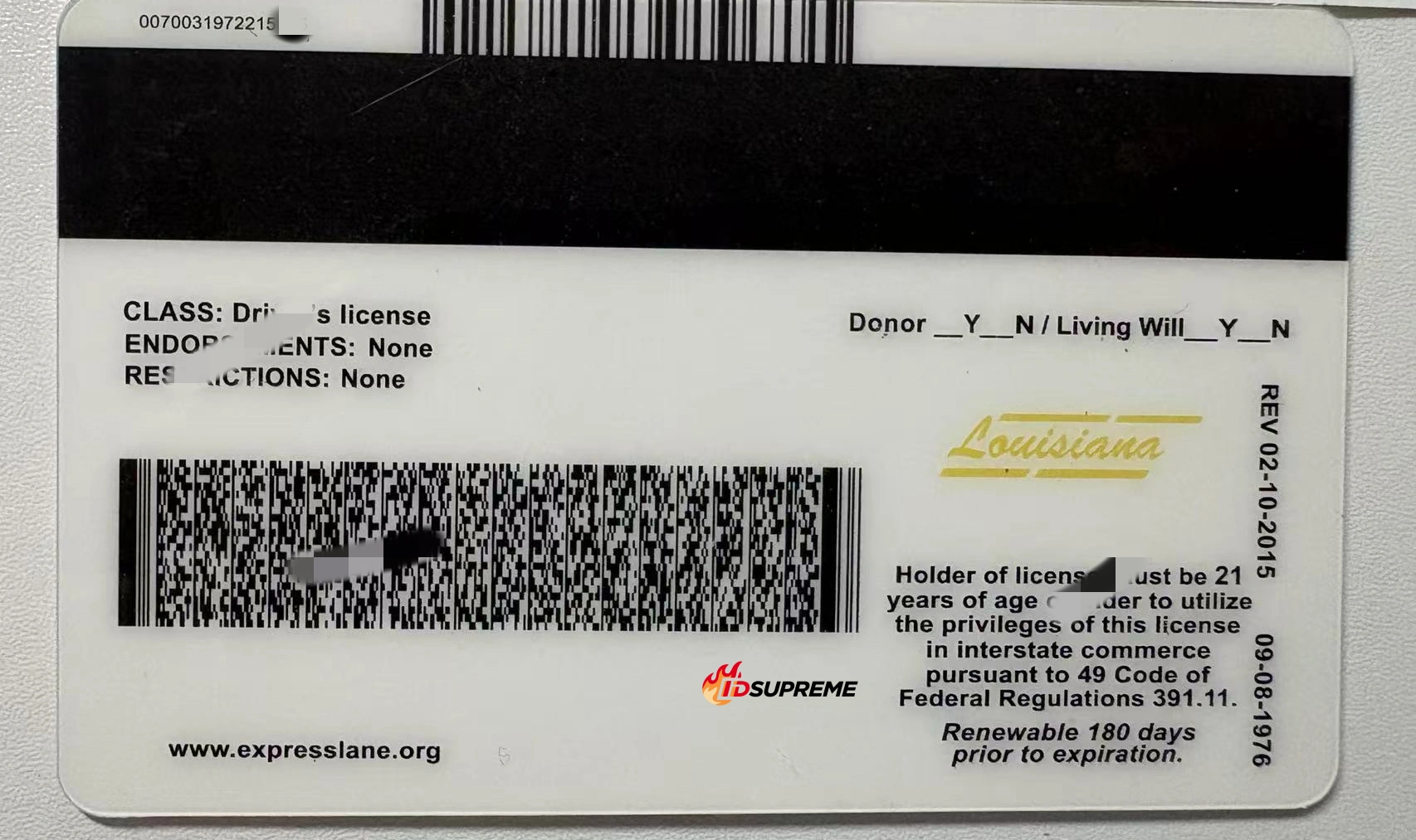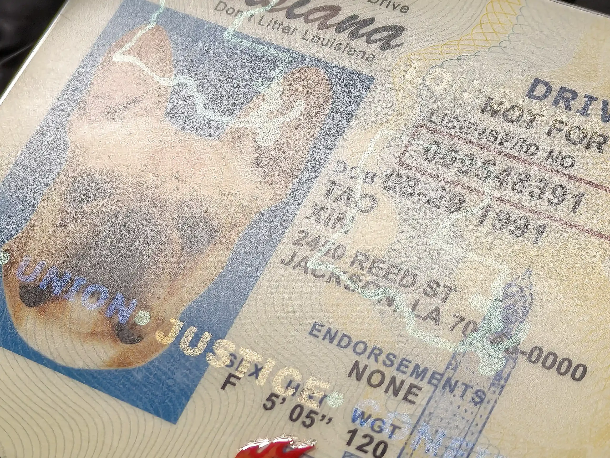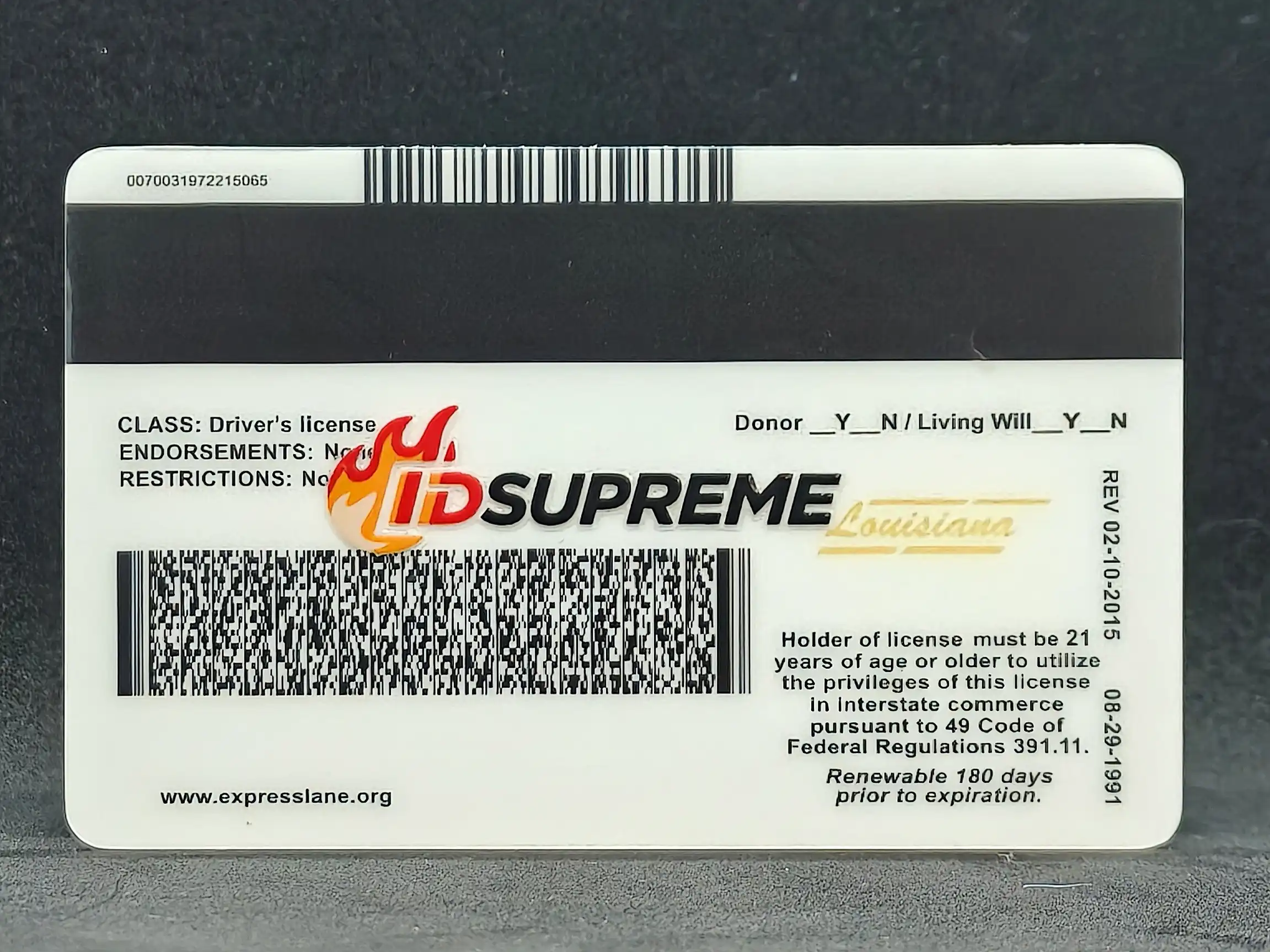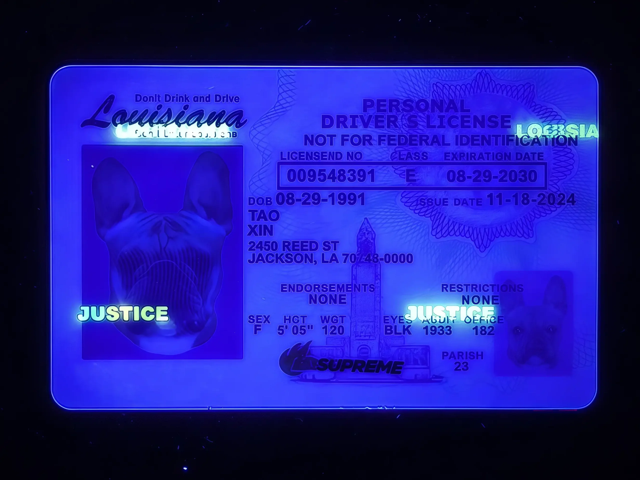 Crafted to mirror the real Louisiana driverβs license β warm-tone background with the state outline, fleur-de-lis watermark, and a clean two-sided layout. Printed on high-grade Teslin with PET laminate for a real-deal finish.