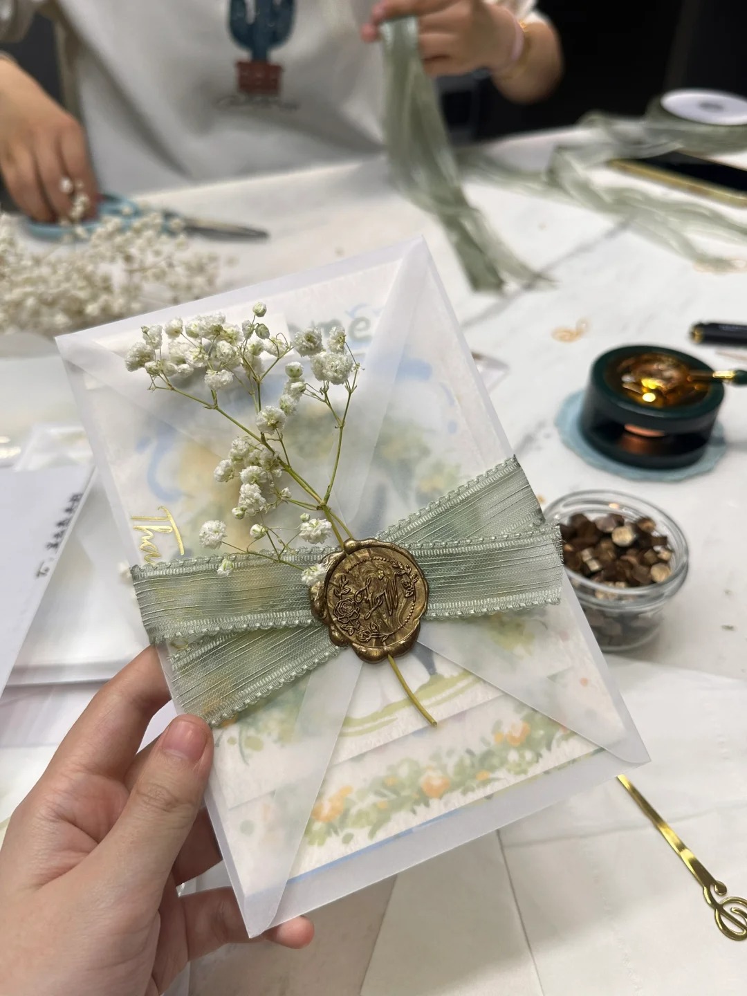 Set Includes: Invitation card + dried flower wax-sealed envelope + binding strap; One order with 10 sets a total